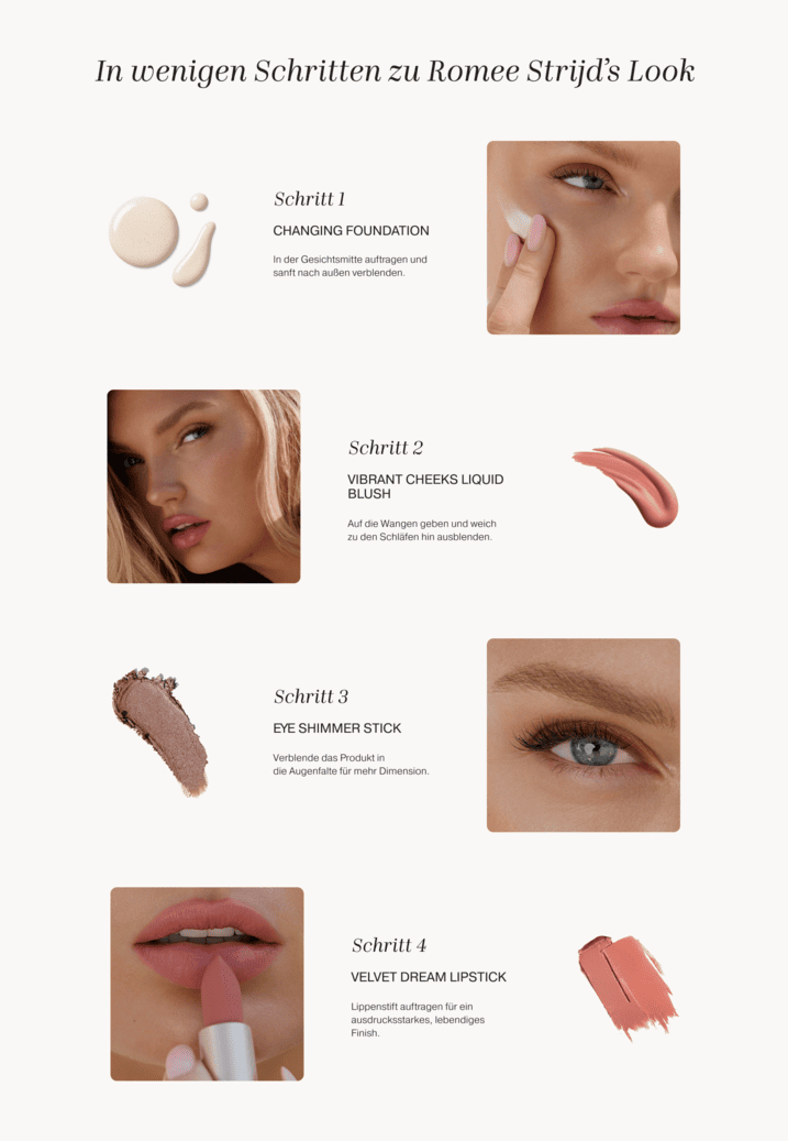 Als Frau, die mühelos viele Rollen unter einen Hut bringt – Mutter, Partnerin, Freundin, Model, Unternehmerin, Kreative und Inspiratorin – weiß Romee, wie dynamisch das Leben sein kann. Und geradein dieser Geschäftigkeit wird Einfachheit unerlässlich: Produkte, die man ohne zu zögern zur Hand nehmen kann, die multifunktional sind und die natürliche Schönheit unterstreichen. Romee verkörpert genau das: Weniger ist mehr, aber mit Wirkung. Das macht sie zur perfekten Markenbotschafterin, um unsere Mission voranzutreiben: hochwertige, multifunktionale Essentials zu kreieren, die moderne Frauen dabei unterstützen, ihren authentischen Alltagslook zu finden, ohne weiter suchen zu müssen.